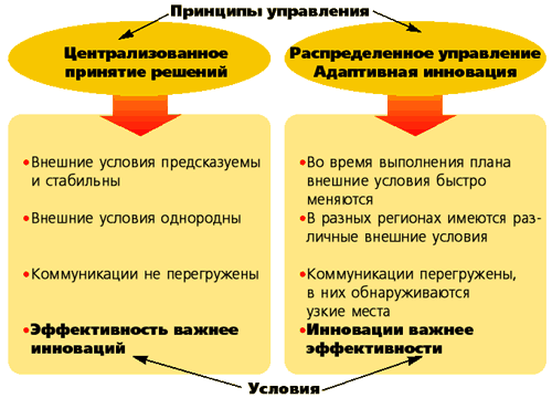 Адаптивные инновации - термин, используемый в эволюционной биологии для обозначения появления новых функций организмов, принадлежащих к определенному виду, в ответ на изменение внешних условий. В интерпретации Теллина этот термин относится к способности каждой подсистемы реагировать на локальные внешние условия. Результат - не только множество ответных реакций, гораздо большее, чем может быть порождено из центра, но и способность каждой подсистемы приспосабливаться к специфической для нее среде. В подобного рода системах миссия организации становится ключевым информационным компонентом (геномом, если продолжать биологическую аналогию), с учетом которого осуществляется адаптация. С моей точки зрения, понятие адаптивной инновации является только удачной аналогией и не привносит ничего нового в методологические построения Теллина. Тем более что в Hoshin Kanri (целевое управление и управление целями), empowerment (делегирование полномочий и ответственности) и многих других современных технологиях управления проблема адаптивности рассматривается гораздо полнее и серьезнее.